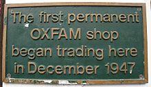 The first Oxfam charity shop in the United Kingdom was established by Cecil Jackson-Cole in Broad Street, Oxford, and began trading in December 1947.[4]