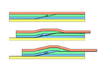Diagram of the evolution of a fault-bend fold or 'ramp anticline' above a thrust ramp, the ramp links decollements at the top of the green and yellow layers