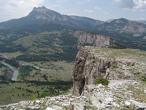 An example of thin-skinned deformation (thrusting) in Montana. Note that the white Madison Limestone is repeated, with one example in the foreground and another at a higher level to the upper right corner and top of the picture.