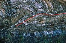 Small thrust fault in the cliffs at Lilstock Bay, Somerset, England; displacement of about two metres (6.6 ft)