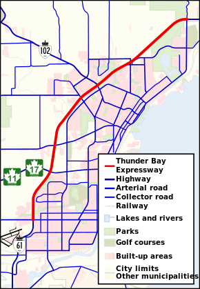 The Thunder Bay Expressway is a four-lane highway with signalized intersections running on the western edge of Thunder Bay, in the Canadian province of Ontario. The route carries portions of Highway 61 as well as the concurrency of Highway 11 and Highway 17 around the city, from south of Arthur Street to Highway 527 northeast of it.