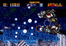 Some enemies will drop power-ups that if picked up by the player will arm the ship with new weaponry, including a variety of missiles and lasers that fire in different patterns.[4] Each weapon has advantages and drawbacks, and are more effective depending on the battle situation the player finds themselves in.[1] The player can hold multiple weapons and cycle through them at will.[3] Other power-ups include shields and satellite ships that revolve their ship and multiplies their firepower.[2][5] Half-way through the game, the player gains a powerful "Thunder Sword" attack which deal massive damage to enemies. It requires that the player has two satellite ships.[1]