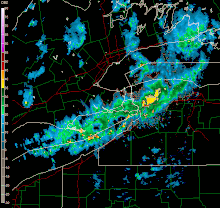 Thundersnow, while relatively rare anywhere, is more common with lake-effect snow in the Great Lakes area of the United States and Canada, the Midwestern United States, and the Great Salt Lake. Thundersnow also occurs in Halifax, Nova Scotia, and in the Northeastern United States, especially in New England and New York, sometimes several times per winter season. On December 30, 2019, a severe thunderstorm warning was issued for parts of Massachusetts for a thunderstorm cell that was producing thundersnow, thundersleet, and thunderice.[3] Bozeman, Montana also sees thundersnow more often than average with these storms typically occurring in April or May. In the United States, March is the peak month of formation; on average, only 6.4 events are reported per year.[4]