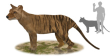 Thylacinus potens ("powerful pouched dog") was the largest species of the family Thylacinidae, originally known from a single poorly preserved fossil discovered by Michael O. Woodburne in 1967 in a Late Miocene locality near Alice Springs, Northern Territory. It preceded the most recent species of thylacine by 4–6 million years,[2] and was 5% bigger,[3] was more robust and had a shorter, broader skull. Its size is estimated to be similar to that of a grey wolf; the head and body together were around 5 feet long, and its teeth were less adapted for shearing compared to those of the now-extinct thylacine.[2]
