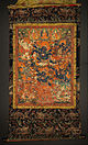 Thangkas, a syncrestistic art of Chinese hanging scrolls with Nepalese and Kashmiri painting, first survive from the eleventh century. Rectangular and intricately painted on cotton or linen, they are usually traditional compositions depicting deities, famous monks, and other religious, astrological, and theological subjects, and sometimes mandalas. To ensure that the image will not fade, the painting is framed in colorful silk brocades, and stored rolled up. The word thangka means "something to roll" and refers to the fact that thangkas can easily be rolled up for transportation.