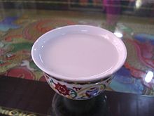 The Cuisine of Tibet is quite distinct from that of its neighbours. Tibetan crops must be able to grow at high altitudes, although a few areas in Tibet are low enough to grow such crops as rice, oranges, lemon and bananas.[9] The most important crop in Tibet is barley. Flour milled from roasted barley, called tsampa, is the staple food of Tibet. It is eaten mostly mixed with the national beverage, the butter tea. Butter tea perfectly fits the needs of the human body in these high altitudes as it contains butter (protein and fat), milk (protein, fat and calcium), salt and tea. Tibetan cuisine contains a wide variety of dishes. The most famous are Momos (Tibetan dumplings). Balep is Tibetan bread eaten for breakfast and lunch. There many other types of balep bread and fried pies. Thukpa is noodle soup. It consists of noodles of various shapes, vegetables, and meat in broth. Tibetan cuisine is traditionally served with bamboo chopsticks, in contrast to other Himalayan cuisines which are eaten by hand. Small soup bowls are also used by Tibetans, and the rich are known to have used bowls of gold and silver.[10] Since only a few crops grow at such high altitudes, many features of Tibetan cuisine are imported, such as tea, rice and others. Meat dishes are likely to be yak, goat, or mutton, often dried, or cooked into a spicy stew with potatoes. Tibetans would never eat dogs and fish only in special cases as dogs are regarded as domestic animals and also guard dogs, and fishes are one of the Eight Auspicious Symbols of Buddhism.