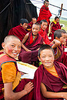 Pilgrims or locals at Drepung Monastery, wearing Ü-Tsang chubas.