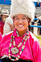 Tibetans tend to be conservative in their dress, and though some have taken to wearing Western clothes, traditional styles still abound. Women wear dark-colored wrap dresses over a blouse, and a colorfully striped, woven wool apron, called pangden signals that she is married. Men and women both wear long sleeves even in summer months.