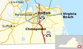 State Route 168 is a primary state highway in the South Hampton Roads region of the U.S. state of Virginia. It runs from the border with North Carolina (where it continues as North Carolina Highway 168 towards the Outer Banks) through the independent cities of Chesapeake and Norfolk where it ends in the Ocean View area near the Hampton Roads Bridge-Tunnel.