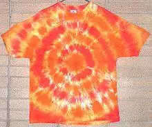 Unlike regular resist-dyeing techniques, tie-dye is characterized by the use of bright, saturated primary colors and bold patterns. These patterns, including the spiral, mandala, and peace sign, and the use of multiple bold colors, have become clichéd since the peak popularity of tie-dye in the 1960s and 1970s. The vast majority of currently produced tie-dyes use these designs, and many are mass-produced for wholesale distribution. However, a new interest in more 'sophisticated' tie-dye is emerging in the fashion industry, characterized by simple motifs, monochromatic color schemes, and a focus on fashionable garments and fabrics other than cotton.[3] A few artists[4][5][6] continue to pursue tie-dye as an art form rather than a commodity.