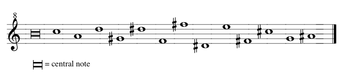 The twelve melodies of Tierkreis are character pieces, representing the twelve signs of the Zodiac. They are serial in conception and all are based on tone rows, though some have more than twelve notes—Libra, for example, has fourteen, with F♯ and D♯ recurring in different octaves. Because music boxes preclude any significant variation in dynamics or timbre, the structure of the Tierkreis melodies emphasize pitch and rhythm.[13] Each melody is centered on a different chromatic pitch, with "Leo" (Stockhausen's own sign) = A, Virgo = A♯, Libra = B, Scorpio = C, etc., and each has its own distinctive tempo, chosen from the "chromatic" tempo scale first described in the composer's famous article, "... How Time Passes ...".[14]