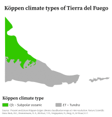 Due to its latitude, the island has a cold oceanic climate.[8] The influences from the surrounding ocean and the predominant winds from the west result in the climate being uniform throughout the province.[9] Mean annual temperatures are low, with winter temperatures averaging close to 0 °C (32 °F) and summer temperatures averaging around 10 °C (50 °F).[8][9] The strong westerly winds from the Pacific Ocean decrease the perception of the temperature (wind chill).[8] In the extreme south in the Beagle Channel which is surrounded by mountains rising above 100 m (330 ft), winds can exceed 100 km/h (62 mph).[8] The island averages around 700 mm (28 in) of precipitation per year which is fairly evenly distributed throughout the year with a slight maximum in Autumn.[9] Snowfall is abundant throughout the island.[9] Much of this island can be classified as within the Magellanic subpolar forests ecoregion.[10]