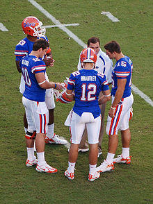Before the 2007 season had even come to a close, Florida coach Urban Meyer stated that he would likely use two quarterbacks during the 2008 season to take some of the workload off of Tebow's shoulders.[54] Tebow led the Gators in rushing in 2007[55] but also had to play through a bruised shoulder and broken non-throwing hand.[54] Before the 2008 season even started, Tebow had his name pulled from consideration for the Playboy Preseason All-American team because it conflicted with his Christian beliefs.[56]