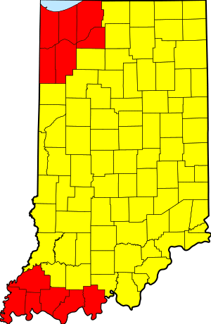 Indiana observes Eastern Time, except for twelve of its 92 counties, which observe Central Time.[2] Six of these counties are in northwestern Indiana, near Chicago (which observes Central Time), and six are in southwestern Indiana, near Evansville, where the metro area includes portions of southeastern Illinois and western Kentucky, which also observe Central Time. The twelve counties are: