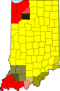 | c.c.* | coordinates* | TZ* | comments* | UTC offset | DST | Location and counties within Indiana | Notes | ||