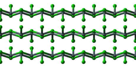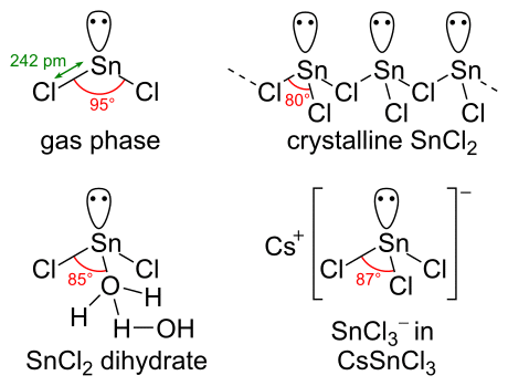 SnCl2 has a lone pair of electrons, such that the molecule in the gas phase is bent. In the solid state, crystalline SnCl2 forms chains linked via chloride bridges as shown. The dihydrate is also three-coordinate, with one water coordinated on to the tin, and a second water coordinated to the first. The main part of the molecule stacks into double layers in the crystal lattice, with the "second" water sandwiched between the layers.