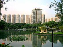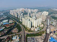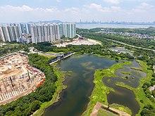 The new town, conceived in 1987 to house 140,000 people, was constructed on 2.4 square kilometres of reclaimed fishponds and wetland representing one quarter of the flat land in the New Territories.[3] The process of land reclamation for the new town was completed in 1990.[4] Formation of the 2.4 km2 was estimated to cost HK$820 million in a contract signed with a Chinese joint-venture company. 20 million cubic metres of material would be required for the landfill. Maximum possible land formation was 4.88 km2.[5]