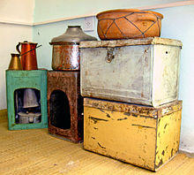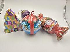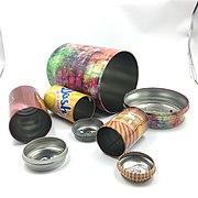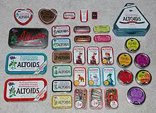 These tinplate cans[2] are often used to package breath mints, throat lozenges, instant coffee, biscuits and holiday treats. Highly decorated "holiday tins" are sold during the holiday season and are popular gifts,[3] and often contain cookies, candy, or popcorn. Similar festive containers are used in Europe for sweets, biscuits, cakes and chocolates, mainly during Christmas, rather than in the summer holidays and in countries with British associations, they are usually called "biscuit tins". In Denmark, butter cookies in tins are produced and sold there, and are also exported to other countries.[4] These types of smaller tin boxes are sometimes reused to store items, or to create kits, such as a survival kit.[5] A hobby involves modifying tin boxes with decorations and embellishments.[6]