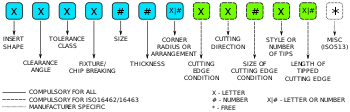 Inserts used for turning and milling are often numbered according to ISO standard 1832. This standard aims to make the naming, specifying and ordering of inserts a simple, consistent and traceable process. This standard takes into account both metric and imperial systems of units, although certain elements differ for each unit system. The code consists of up to 13 symbols with the first 12 of them being compulsory for inserts composed of cubic boron or poly-crystalline diamond and the first 7 being compulsory for all other types of composition.[2]