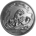 The British hunted tigers, not just to emulate the Mughals and other local elites in this "royal" sport, but also as a symbolic defeat of Tipu Sultan and any other ruler who stood in the path of British domination.[41] The tiger motif was used in the "Seringapatam medal" which was awarded to those who participated in the 1799 campaign, where the British lion was depicted as overcoming a prostrate tiger, the tiger being the dynastic symbol of Tipu's line. The Seringapatam medal was issued in gold for the highest dignitaries who were associated with the campaign as well as select officers on general duty, silver for other dignitaries, field officers and other staff officers, in copper-bronze for the non-commissioned officers and in tin for the privates. On the reverse it had a frieze of the storming of the fort while the obverse showed, in the words of a nineteenth-century tome on medals, "the BRITISH LION subduing the TIGER, the emblem of the late Tippoo Sultan's government, with the period when it was effected and the following words 'ASSUD OTTA-UL GHAULIB', signifying the Lion of God is the conqueror, or the conquering Lion of God."[42]