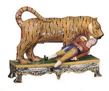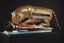 Tipu's Tiger or Tippu's Tiger is an eighteenth-century automaton or mechanical toy created for Tipu Sultan, the ruler of the Kingdom of Mysore in India. The carved and painted wood casing represents a tiger savaging a near life-size European man. Mechanisms inside the tiger and man's bodies make one hand of the man move, emit a wailing sound from his mouth and grunts from the tiger. In addition a flap on the side of the tiger folds down to reveal the keyboard of a small pipe organ with 18 notes.[1]
