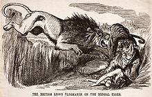 Tipu's Tiger is also notable as a literal image of a tiger killing a European, an important symbol in England at the time, and from about 1820 the "Death of Munro" became one of the scenes in the repertoire of Staffordshire pottery figurines.[12][15] Tiger-hunting in the British Raj, is also considered to represent not just the political subjugation of India, but in addition, the triumph over India's environment.[41] The iconography persisted and during the rebellion of 1857, Punch ran a political cartoon showing the Indian rebels as a tiger, attacking a victim in an identical pose to Tipu's Tiger, being defeated by the British forces shown by the larger figure of a lion.