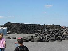Because tires are highly durable and non-biodegradable, they can consume valued space in landfills.[1] In 1990, it was estimated that over 1 billion scrap tires were in stockpiles in the United States. As of 2015, only 67 million tires remain in stockpiles.[2] From 1994 to 2010, the European Union increased the amount of tires recycled from 25% of annual discards to nearly 95%, with roughly half of the end-of-life tires used for energy, mostly in cement manufacturing.[3][4]