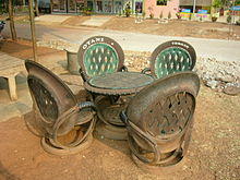 Used tires are also employed as exercise equipment for athletic programs such as American football.[22] One classic conditioning drill that hones players' speed and agility is the "Tire Run" where tires are laid out side by side, with each tire on the left a few inches ahead of the tire on the right in a zigzag pattern. Athletes then run through the tire pattern by stepping in the center of each tire. The drill forces athletes to lift their feet above the ground higher than normal to avoid tripping.[23] Other athletic uses include tire flipping (tractor or large truck tires typically used) or for upper cardio conditioning by hitting a tire repetitively with a sledge hammer.[24]