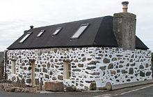 The island is known for its vernacular architecture, including a 'blackhouse' and 'white houses', many retaining their traditional thatched roofs, as well as its unique 'pudding' or 'spotted houses' where only the mortar is painted white.