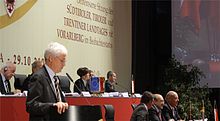 The Euroregion Tyrol-South Tyrol-Trentino was founded in 1998. The aim is to strengthen cooperation between the separated countries.[10] In several areas, such as mobility, agriculture, education and culture will be tried to promote exchange and to raise the awareness of the cultural and historical heritage of the region of Tyrol in the minds of the population. Cross-border projects will be initiated to improve the relationship between the different language groups. To represent common ideas and values in Europe, the Euroregion has a joint office in Brussels since 1995.[11] The headquarters of the office is in Bolzano. Joint decisions are taken by organized three diet (in German: Dreier-Landtag), which have been held since 1991 mostly every two to three years with the state Diets of Trento (provincial council of Trentino), Bolzano (provincial council of South Tyrol) and Innsbruck (state council of Tyrol (State)). In 2011, the region was institutionalized and since then has its own legal entity.