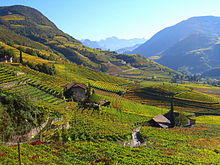 The Tyrolean dishes show only slight differences throughout Tyrol. Due to the Mediterranean conditions in the southern part of Tyrol, a lot of wine is grown and is therefore also an important part of the Tyrolean dish, especially in South Tyrol and Trentino. Famous wines from this area are the Gewürztraminer, Pinot Blanc, Pinot Grigio and Chardonnay.[33] Furthermore, a lot of apples are grown in the Region of Trentino-South Tyrol. In this region also a food culture is cultivated with a mixture of Italian and Tyrolean specialties.[34][35]