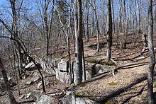 The park pays tribute to Tishomingo County's remarkable geography of massive rock formations, found here and in the immediately surrounding areas and nowhere else in Mississippi. The cliffs, valleys and abundant outcroppings of carboniferous sandstone and limestone represent the southwestern extremity of the Southern Appalachian Plateau.[5] The boulders and towering cliffs of Hartselle Sandstone, together with the outcrops of Bangor Limestone and the creek which carves through it all, compose "some of the most picturesque and rugged scenery in the state."[6]