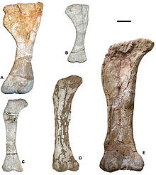 Titanosaurus indicus was first named by British paleontologist Richard Lydekker in 1877, as a new taxon of dinosaur based on two caudals and a femur collected on different occasions at the same location in India.[31] While it was later given a position as a sauropod within Cetiosauridae by Lydekker in 1888,[32] he named the new sauropod family Titanosauridae for the genus in 1893, which included only Titanosaurus and Argyrosaurus, united by procoelous caudals, opisthocoelous presacrals, a lack of pleurocoels and open chevrons.[33] Following this, Austro-Hungarian paleontologist Franz Nopcsa reviewed reptile genera in 1928, and provided a short classification of Sauropoda, where he placed the Titanosaurinae (a reranking of Lydekker's Titanosauridae) in Morosauridae, and included the genera Titanosaurus, Hypselosaurus and Macrurosaurus because they all had strongly procoelous caudals.[34] German paleontologist Friedrich von Huene provided a significant revision of Titanosauridae the following year in 1929, where he reviewed the dinosaurs of Cretaceous Argentina, and named multiple new genera. Huene included multiple species of Titanosaurus from India, England, France, Romania, Madagascar and Argentina, Hypselosaurus and Aepisaurus from France, Macrurosaurus from England, Alamosaurus from United States, and Argyrosaurus, Antarctosaurus, and Laplatasaurus from Argentina. The material between them represented almost all regions of the skeleton, which showed they were derived sauropods Huene interpreted as closest to Pleurocoelus of the various non-titanosaurid genera.[35]