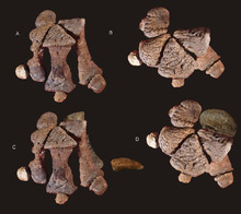 Some titanosaurs had osteoderms. Osteoderms were first confirmed in the genus Saltasaurus but are now known to have been present in a variety of titanosaurs within the clade Lithostrotia.[17] The exact arrangement of osteoderms on the body of a titanosaur is not known, but some paleontologists consider it likely that the osteoderms were arranged in two parallel rows on the animal's back, an arrangement similar to the plates of stegosaurs.[18] Several other arrangements have been proposed, such as a single row along the midline, and it is possible that different species had different arrangements. The osteoderms were certainly far more sparse than those of ankylosaurs, and did not completely cover the back in scutes. Because of their sparse arrangement, it was unlikely that they served a significant role in defense. However, they may have played an important role in nutrient storage for titanosaurs living in highly seasonal climates and for female titanosaurs laying eggs.[19][20] Osteoderms were present on both large and small species, so they were not solely used by smaller species as protection against predators.[21]