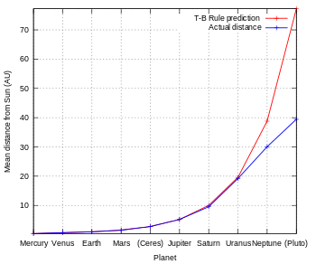 The Titius–Bode law predicts planets will be present at specific distances in astronomical units, which can be compared to the observed data for several planets and dwarf planets in the solar system: