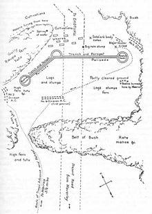 The Māori camp had been established just four days earlier, in hilly, bush-covered country below the high wooded tableland of Okutuku, a village that had been raided in January 1866 as part of a "bush-scouring" campaign by Major-General Trevor Chute during the earlier hostilities. About 100 metres of 3.6m-high loose palisading had been hastily erected in a concave shape, blocking the path to the pā, while other defensive works included a long trench 2m wide and 2m deep behind the palisade, as well as hidden rifle pits and three taumaihi, 6m-high towers built of packed soil and ferns.[11] While men in the trenches could fire through a gap beneath the palings of the palisade, others on an earth bank behind the trenches could fire through gaps in the palings, while a third line of fire could be effected from the taumaihi.[1] Tītokowaru had placed his men on high alert and in the misty dawn, sentries caught sight of Whitmore's advance guard moving through the bush. The Moturoa defenders were silently roused and took their firing positions without being seen by the attacking force.[11]