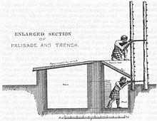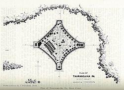 Tītokowaru used those five weeks to demonstrate his hold on the Wanganui hinterland, burning farms and abandoned military posts and driving off stock, but also laboring over the fortifications at Tauranga-ika until it became one of the most formidable modern pā ever built.[1] The pā had been built in a diamond shape, 135 metres long on each side, complete with trenches, rifle pits, parapets and a double line of stockade.[12] The palisade, attached to 30 cm-thick posts, reached 5m above the ground, with a gap at its base to allow defenders in the trenches to fire beneath it. Inside the pā were trenches, covered walkways and shellproof underground shelters roofed with strong timbers, packed earth and galvanised roofing iron. At one corner was a 10m-high taumaihi,[13] providing a third level of fire. Inspecting it later, Whitmore said, "No troops in the world could have hewn their way through a double row of strong palisades, backed by rifle pits and flanked by two-storey erections, such as are constructed in this fortification, defended by excellent shots and desperate men."[14]