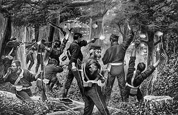 Less than three weeks later, on 7 September 1868, McDonnell returned to the Ngāti Ruanui heartland, this time determined to skirt Te Ngutu o Te Manu and first strike at another village to the east, Ruaruru, before returning to Te Ngutu. The plan went awry when his column of 360 men became disoriented in the forest, missing Ruaruru and approaching Te Ngutu from the north. Shots fired at the occupants of outlying huts warned Tītokowaru of the direction of McDonnell's approach, giving the chief time to organise his defence. He remained in the pā with 20 men and sent the remaining 40, in small groups, to hidden rifle pits in bush surrounding a clearing that led to the palisade, and possibly other positions within the clearing itself. McDonnell's force, attempting to storm the palisade, came under immediate and very heavy fire from front, right and rear, with troops "being knocked over like ninepins" by unseen marksmen.[1] Again the heart of the first soldier killed was cut from his body as a Hauhau war rite.[1][9] McDonnell hesitated, torn between advancing with further losses or retreating, watching as the inexperienced volunteer recruits from the Wellington Rangers and Rifles either bunched together and froze or panicked and fled.[9] McDonnell then gave the order to retreat, with casualties carried out first and McDonnell following with 80 men. Major Gustavus von Tempsky, near the palisade, was shot dead while awaiting orders, and four other officers – two captains and two lieutenants – were also killed. Tītokowaru's small attacking force was quickly reinforced by warriors from neighboring villages and McDonnell's retreat to Waihi came under relentless fire from Māori who followed them almost to the Waingongoro, inflicting further casualties.[1] The expedition left 24 Europeans killed and 26 wounded.[9]