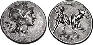 Titus Didius first appears in history as triumvir monetalis, one of the three men tasked with minting coins, probably in 113 or 112. The reverse of his denarii shows two gladiators fighting. Michael Crawford suggests that it may have been a political promise from Didius to offer gladiatorial shows, should he be elected curule aedile (the magistrate in charge of organising such games).[3] It is not known whether Didius was subsequently elected.