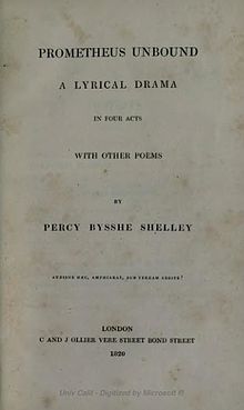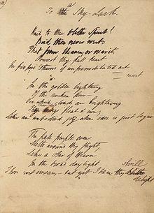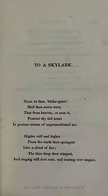 "To a Skylark" is a poem completed by Percy Bysshe Shelley in late June 1820 and published accompanying his lyrical drama Prometheus Unbound by Charles and James Collier in London.[1]
