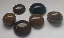 The true toadstone was taken by contemporary jewellers to be no bigger than the nail of a hand and they varied in colour from a whitish brown through green to black, depending on where they were buried.[2] They were supposedly most effective against poison when worn against the skin, on which occasion they were thought to heat up, sweat and change colour.[3] If a person was bitten by a venomous creature a toadstone would be touched against the affected part to effect a cure.[4] Alternatively Johannes de Cuba, in his book Gart der Gesundheit of 1485, claimed that toadstone would help with kidney disease and earthly happiness.[5]