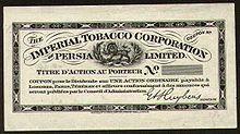 On 20 March 1890, Nasir al-Din Shah granted a concession to Major G. F. Talbot for a full monopoly over the production, sale, and export of tobacco for fifty years. In exchange, Talbot paid the shah an annual sum of £15,000 (present-day £1.845 million; $2.35 million) in addition to a quarter of the yearly profits after the payment of all expenses and a dividend of 5 percent on the capital. By the fall of 1890 the concession had been sold to the Imperial Tobacco Corporation of Persia, a company that some have speculated was essentially Talbot himself as he heavily promoted shares in the corporation.[5] At the time of the concession, the tobacco crop was valuable not only because of the domestic market but because Iranians cultivated a variety of tobacco "much prized in foreign markets" that was not grown elsewhere.[6] A Tobacco Régie (monopoly) was subsequently established and all the producers and owners of tobacco in Persia were forced to sell their goods to agents of the Régie, who would then resell the purchased tobacco at a price that was mutually agreed upon by the company and the sellers with disputes settled by compulsory arbitration.[6]