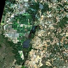Along the western boundary of the state is the floodplain of the Araguaia River, which includes extensive wetlands and Amazon tropical forest ecosystems. Bananal Island, formed by two branches of the Araguaia, is said to be the largest river island in the world.[4][6] It consists mostly of marshlands and seasonally flooded savannas, with gallery forest. Where the two branches meet again they form an inland delta called Cantão, a typical Amazonian igapó flooded forest. The Araguaia is also one of the main links between the Amazonian lowlands and the Pantanal wetlands to the south, but the river is not fully navigable.