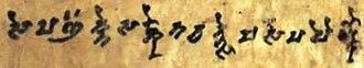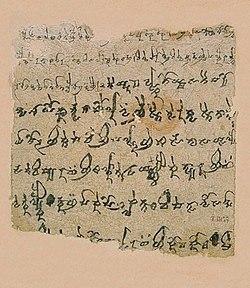 Most of attested Tocharian was written in the Tocharian alphabet, a derivative of the Brahmi alphabetic syllabary (abugida) also referred to as North Turkestan Brahmi or slanting Brahmi. However a smaller amount was written in the Manichaean script in which Manichaean texts were recorded.[30][31] It soon became apparent that a large proportion of the manuscripts were translations of known Buddhist works in Sanskrit and some of them were even bilingual, facilitating decipherment of the new language. Besides the Buddhist and Manichaean religious texts, there were also monastery correspondence and accounts, commercial documents, caravan permits, medical and magical texts, and one love poem.