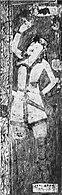 Right: One of the painters, with a label in Tocharian: Citrakara Tutukasya "The Painter Tutuka". Cave of the Painters, Kizil Caves, circa 500 CE.[47][48][49]