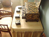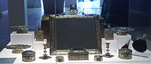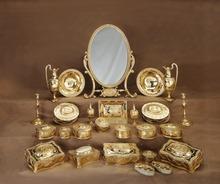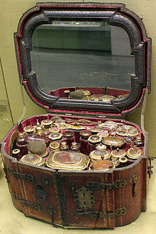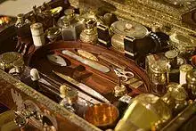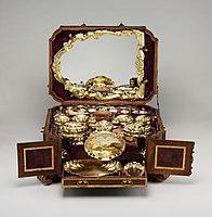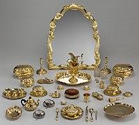 A toilet service is a set of objects for use at the dressing table. The term is usually reserved for large luxury sets from the 17th to 19th centuries, with "toilet set" used for later or simpler sets. Historically, services were made in metal, ceramics, and other materials, for both men and women, though male versions were generally much smaller. The rich had services in gold, silver, or silver-gilt. The contents vary, but typically include a mirror, one or more small ewers and basins, two candlesticks, and an assortment of bowls, boxes, caskets, and other containers.[1] One or more brushes and a pin-cushion, often as a top to a box, are often included. The sets usually came with a custom-made travelling case, and some services were especially designed for travelling.