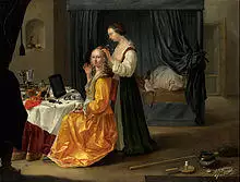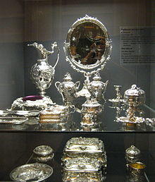 The toilet service was the most important item of "dressing plate", as opposed to table plate, and was often a gift upon marriage;[2] sometimes augmented on the birth of children.[3] It was normally the personal property of the wife. The morning levée was sometimes a semi-public occasion for great persons in the early modern period, and the toilet service might be seen by many people.[4]