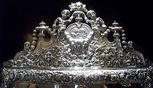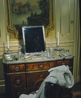 The contents of a service were variable but the classical grouping had as its largest piece the mirror, usually decorated at the top with some form of crest. In the 17th century these were rectangular, usually oblongs in "portrait" format, though the Louvre mirror and the Lennoxlove service use a "landscape" format. The frame normally had a wooden framework holding the glass, over which the metal was fitted.[6] In the 18th century oval mirrors began to be used, and later the introduction of dressing tables with built-in mirrors was part of the decline from fashion of the toilet service. Depictions in art, such as the Zoffany of Queen Charlotte, wife of George III, usually show that the elaborate crest at the top of the mirror has disappeared beneath the lace covers spreading to the sides, which are probably tied round it. These were used to pull over the service on its table when it was not in use, or when husbands or other inconvenient visitors appeared in the dressing room.[7]