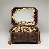The service often contains one or a pair of ewer and basin sets for washing. There is normally a number of other vessels of various sizes and shapes, some covered and others not, which go by a great variety of names, and whose purpose was perhaps always rather undefined. A variety of brushes might be included, and sometimes a small bell. In the 18th century glass and porcelain items might be mixed in with the silver ones. Services also might contain food plates and cutlery (usually just for one) for breakfast or snacks in the bedroom or dressing-room, or when travelling. One large type of bowl is connected with oatmeal, though it seems this might either be made into a facial, or eaten as porridge (or both, with a pair).[10] Descriptions include items such as comb-boxes, glove-trays, soap-boxes, low tazze (or "waiters"), salvers, ecuelles (small bowls with two handles) and others. The 48-piece German Schenk von Stauffenberg service (1740s, now Metropolitan Museum of Art) contains several items for food and drink, including a teapot, and also items for writing, such as an inkstand.[11]
