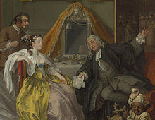 In the 18th century services continued to be made, with both the Rococo and Neoclassical styles lending themselves well to dressing plate. By the mid-century the large service was falling somewhat out of fashion, and fewer were made. The depiction of the toilette in William Hogarth's Marriage à-la-mode: 4. The Toilette (1743), with a mirror larger than in any surviving example, is disapproving,[29] and one of many satirical accounts and caricatures.[30] At the same time the development of dressing tables with integral mirrors, and porcelain vessels, represented an alternative style of toilet equipment. The silver-gilt Neoclassical service made in London in 1779, now in Sweden (illustrated at top) is a late English example, and Philippa Glanville describes the Zoffany portrait of Queen Charlotte as showing "almost the latest flourish of the silver toilet service",[31] although George III gave her another service a few years later.[32]